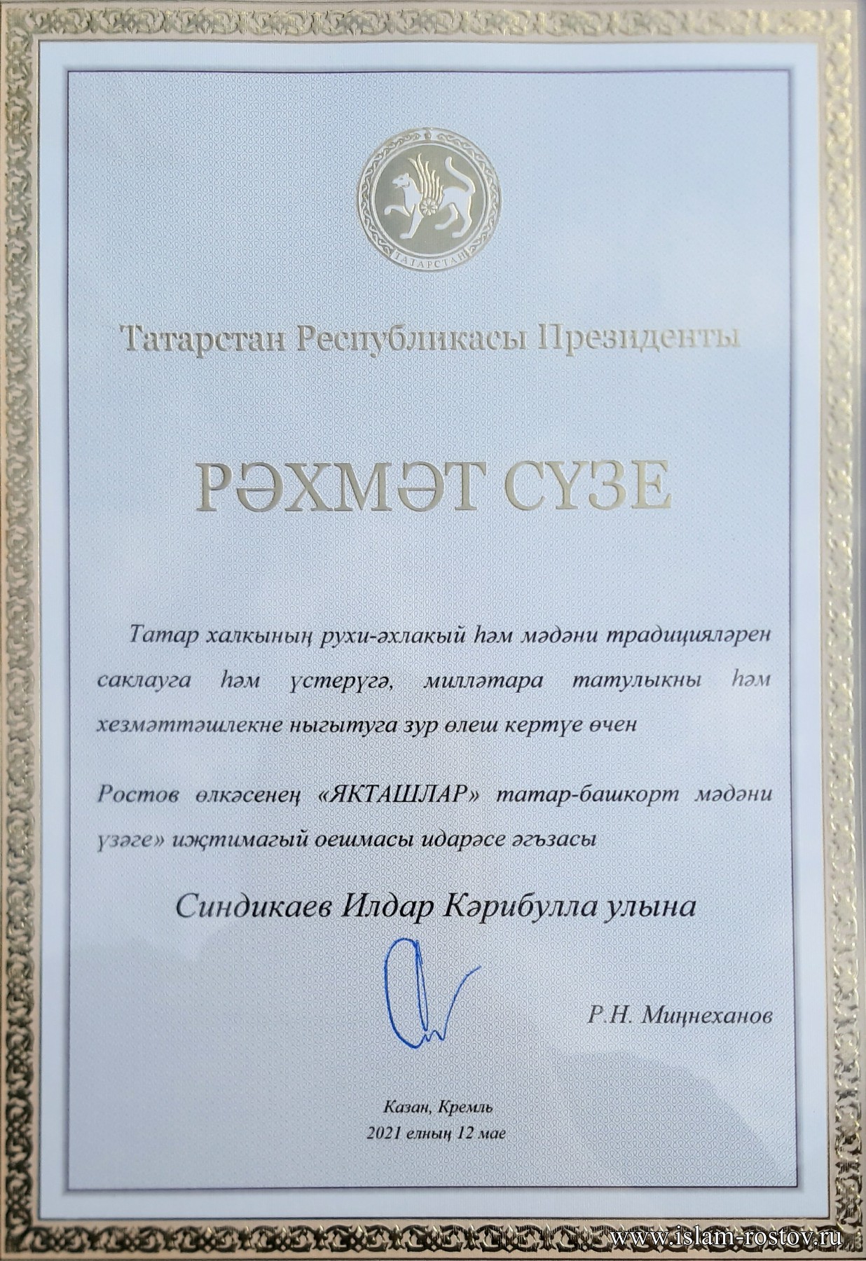 В рамках пленарного заседания, Президент Республики Татарстан  отметил религиозных деятелей государственными наградами. Среди награждённых был сотрудник Центрального Духовного Управления мусульман  Ростовской области, имам-хатыб Ильдар хазрат Синдикаев, награждённый Рустамом Нургалиевичем Миннихановым благодарственной грамотой за заслуги в деле сохранения и развития татарских национальных традиций и укрепления межнационального мира и согласия.