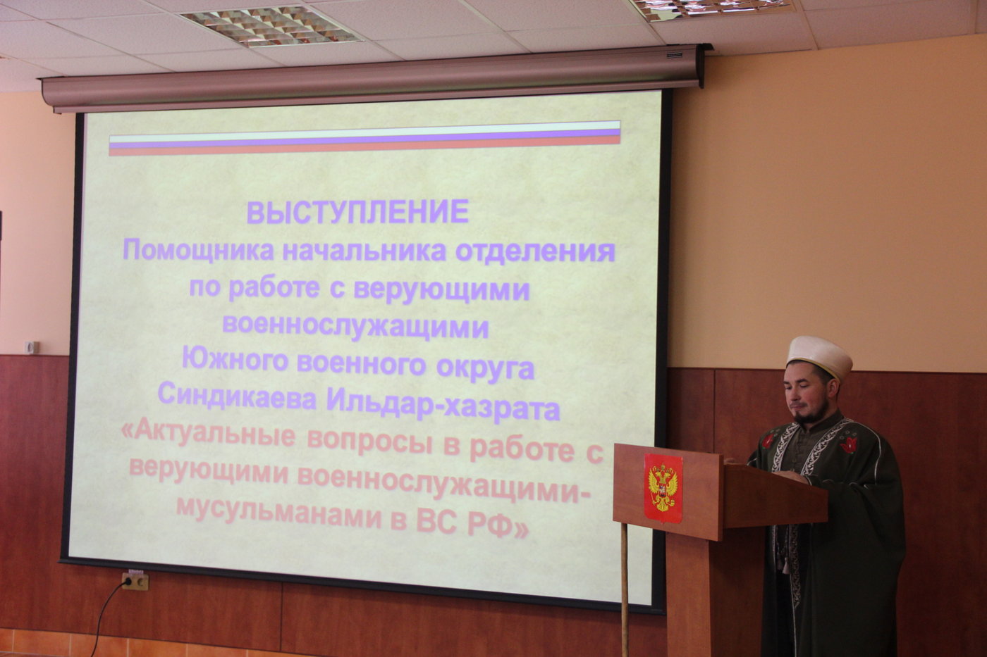 Центральное Духовное Управление мусульман Ростовской области на семинаре представляет имам-хатыб Ильдар хазрат Синдикаев (помощник начальника отделения по работе с верующими военнослужащими мусульманами в ЮВО),также на семинаре принимают участие около 30 штатных помощников командиров по работе с верующими военнослужащими из всех субъектов России — православные священники, исламские духовные деятели и представитель буддийского духовенства.
