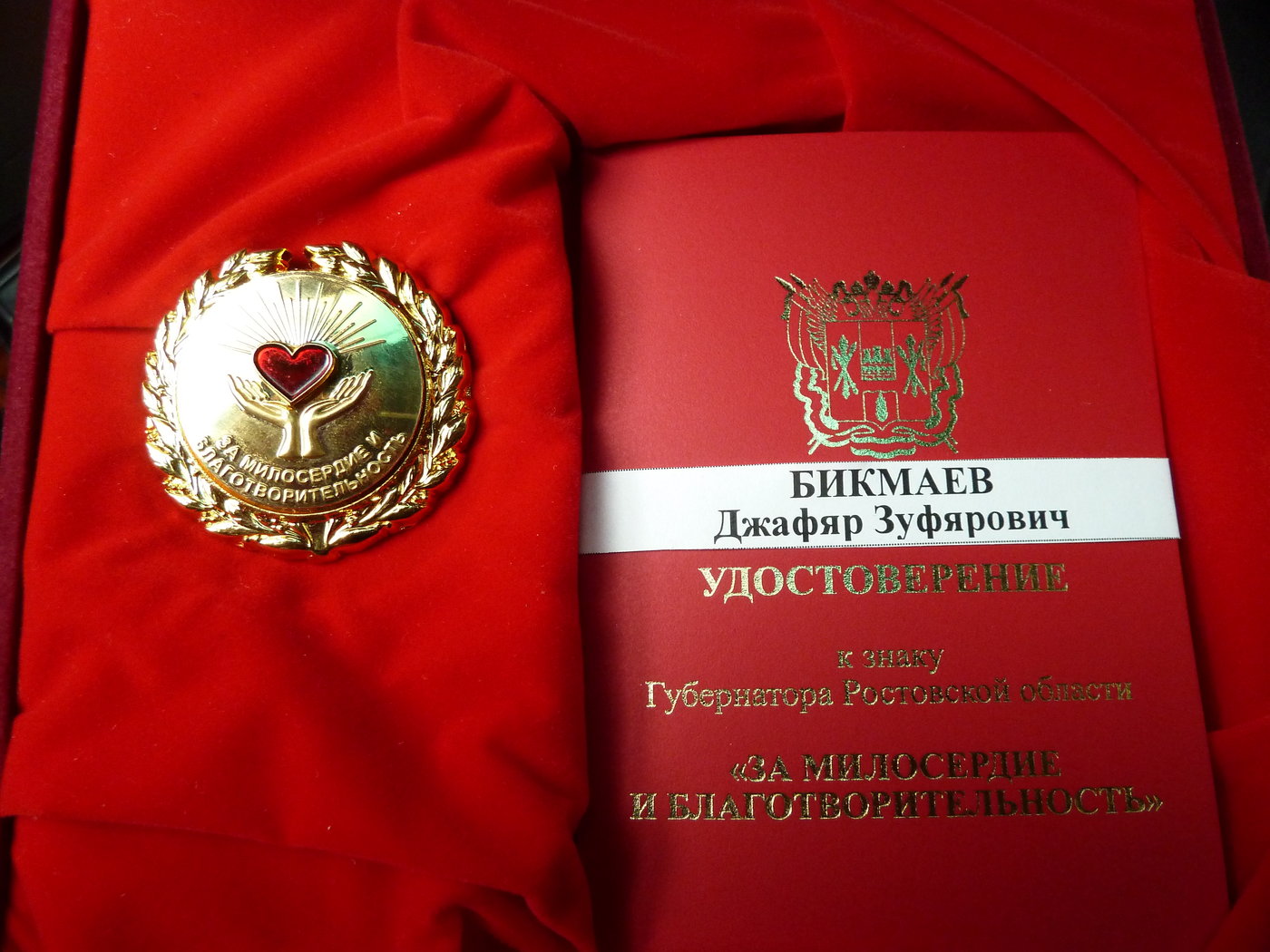 Сегодня, 12 декабря 2016г., в День Конституции РФ губернатор Ростовской области Василий Юрьевич Голубев вручил государственные награды. В числе награждённых и муфтий – председатель Центрального духовного управления мусульман Ростовской области Джафяр Зуфярович Бикмаев, удостоенный награждения за высокие достижения в деятельности религиозных организаций, направленные на возрождение и сохранение межконфессионального мира и согласия, духовных, исторических, культурных традиций, способствующих развитию Ростовской области, знаком Губернатора «За милосердие и благотворительность».