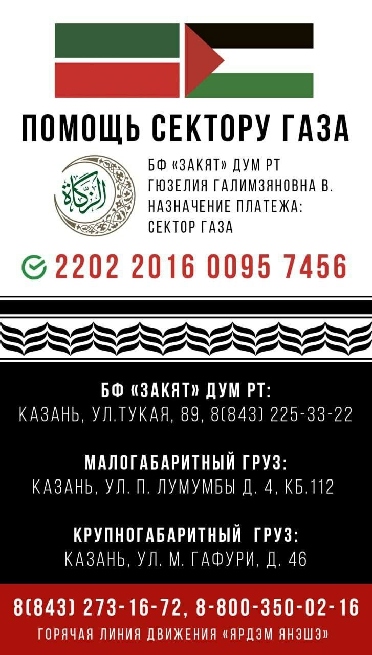 По поручению Раиса Республики Татарстан Рустама Нургалиевича Минниханова, Духовное управление мусульман Республики Татарстан совместно с Правительством Республики Татарстан проработали возможности передачи гуманитарной помощи жителям Сектора Газа из Татарстана. Теперь определены способы и реквизиты оказания поддержки.