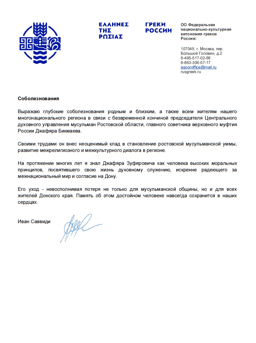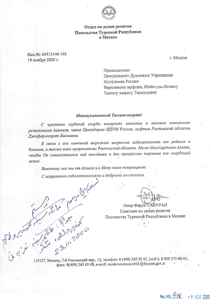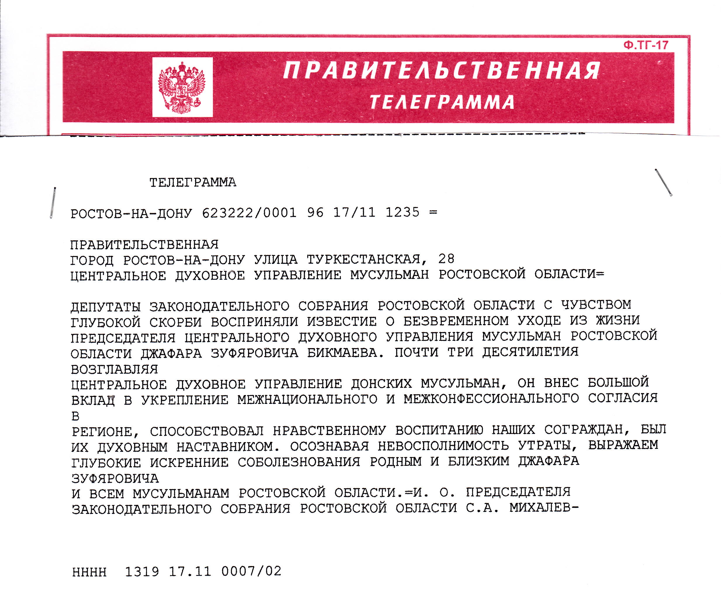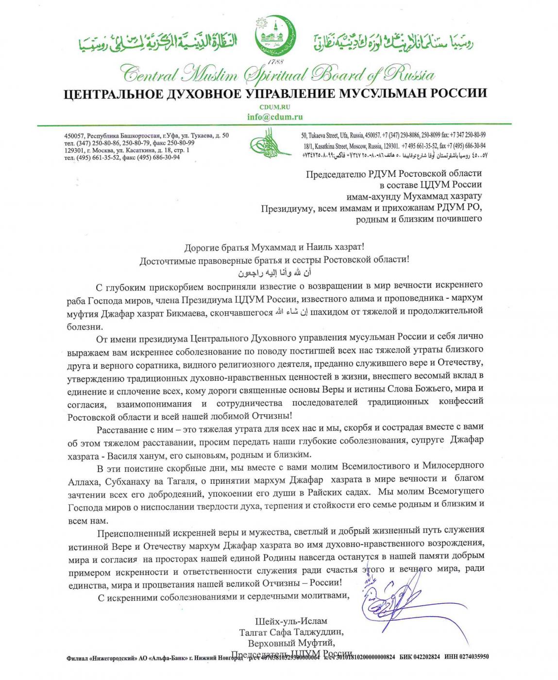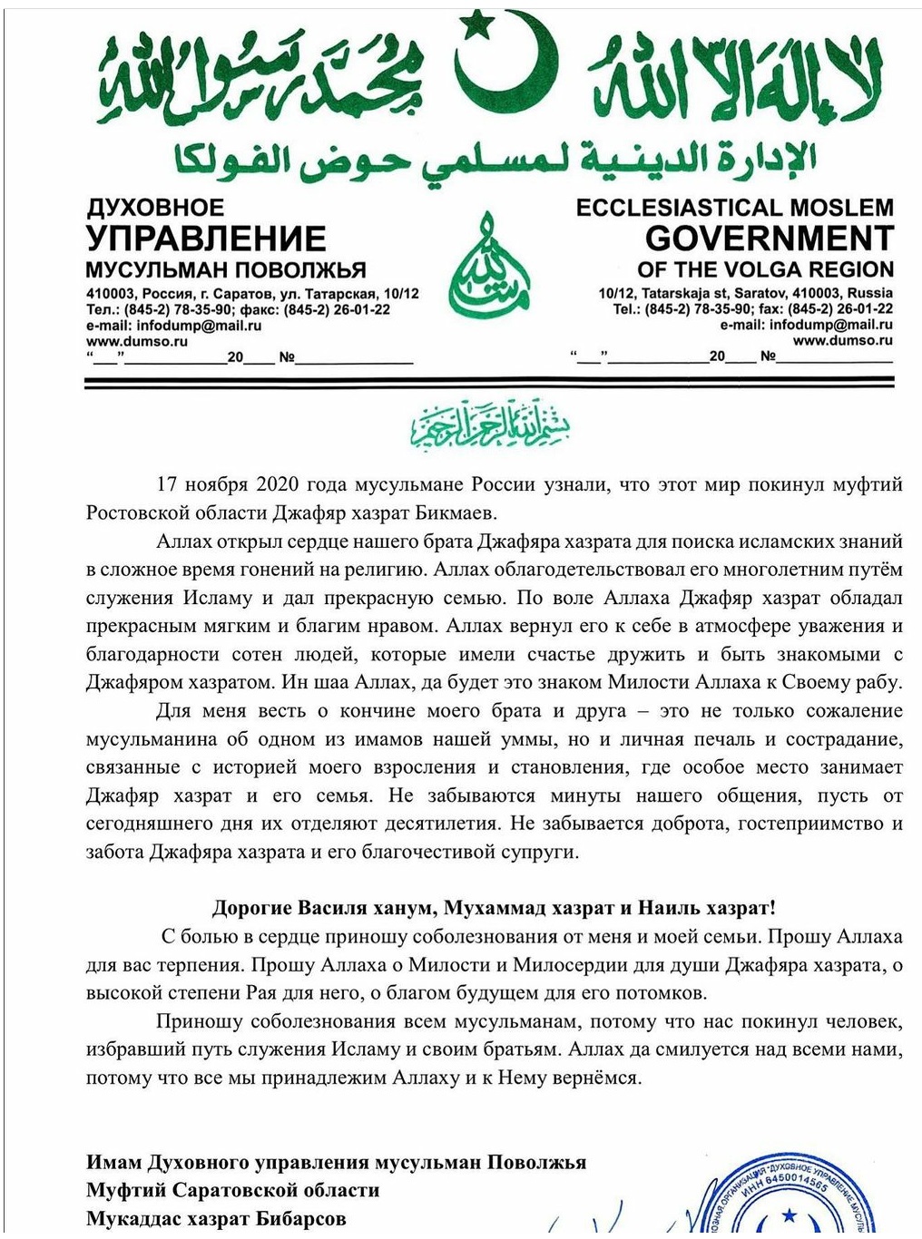 Соболезнования в связи с кончиной муфтия Джафяр хазрата Бикмаева.