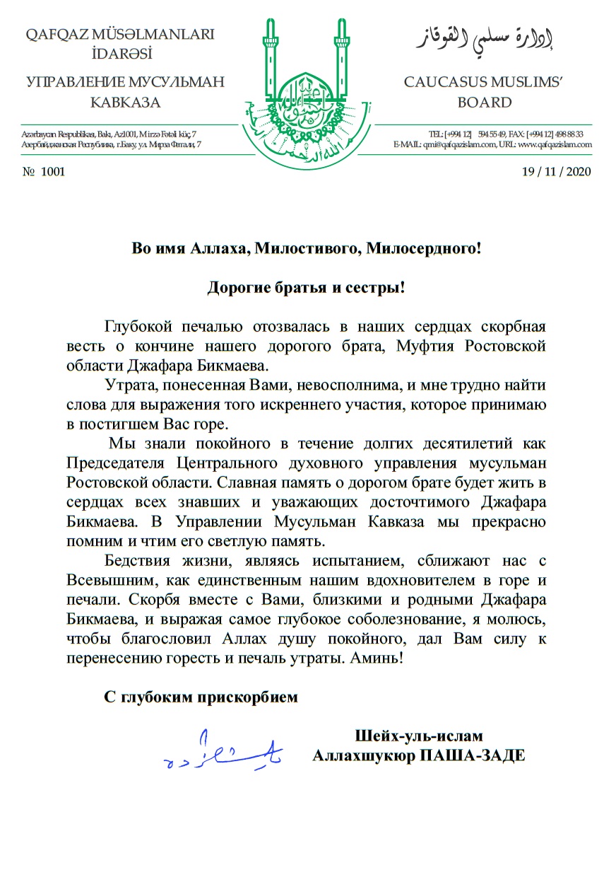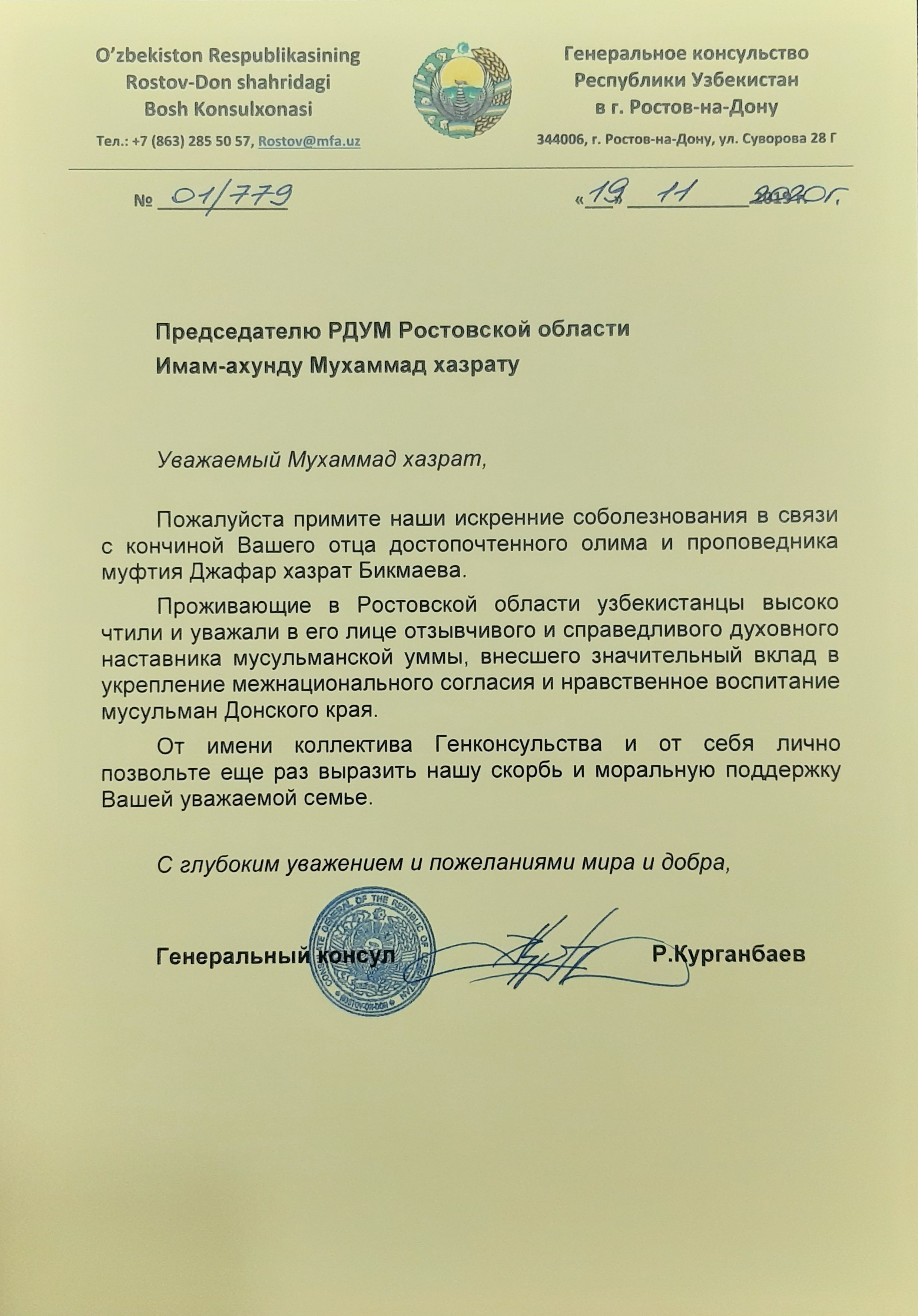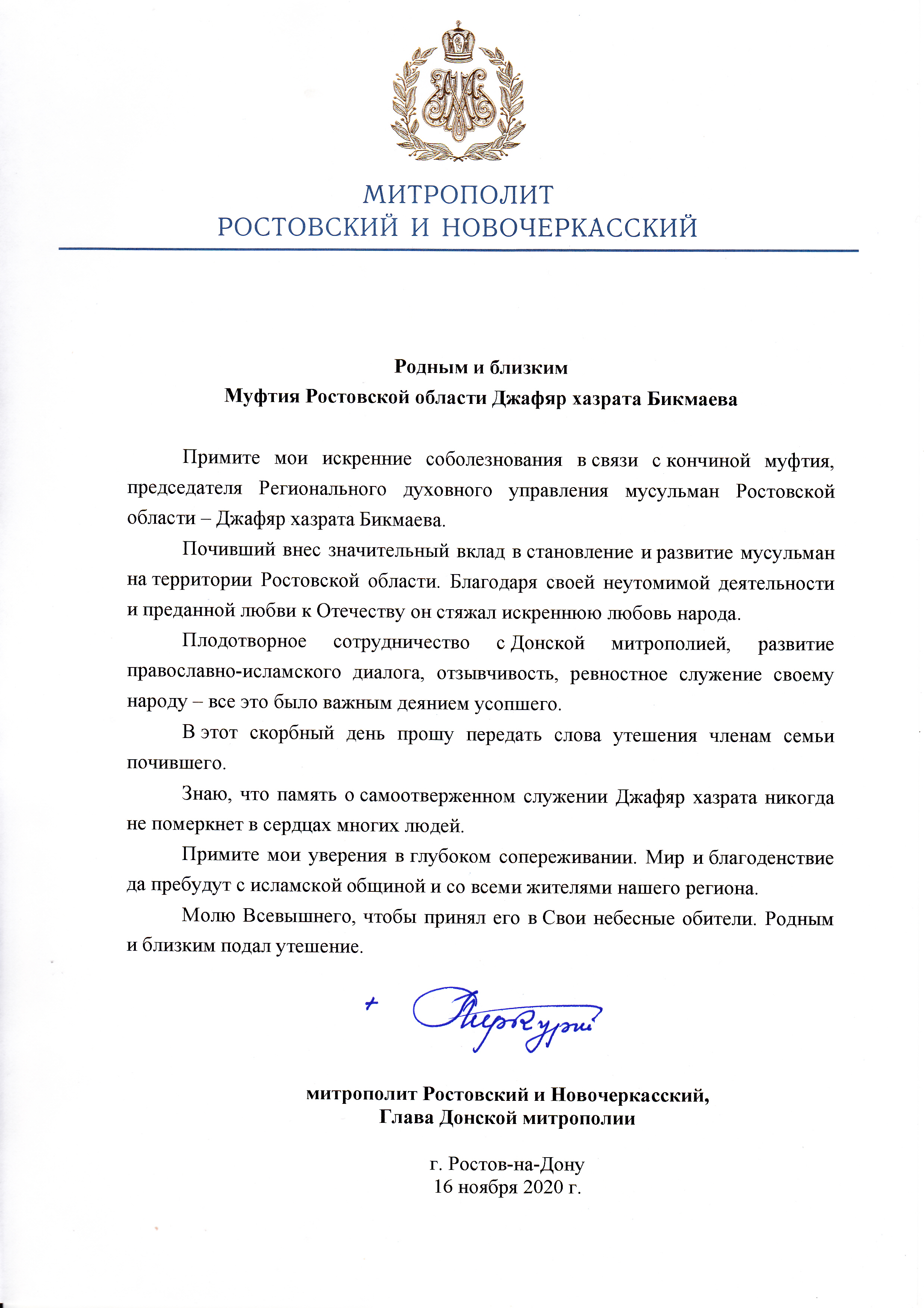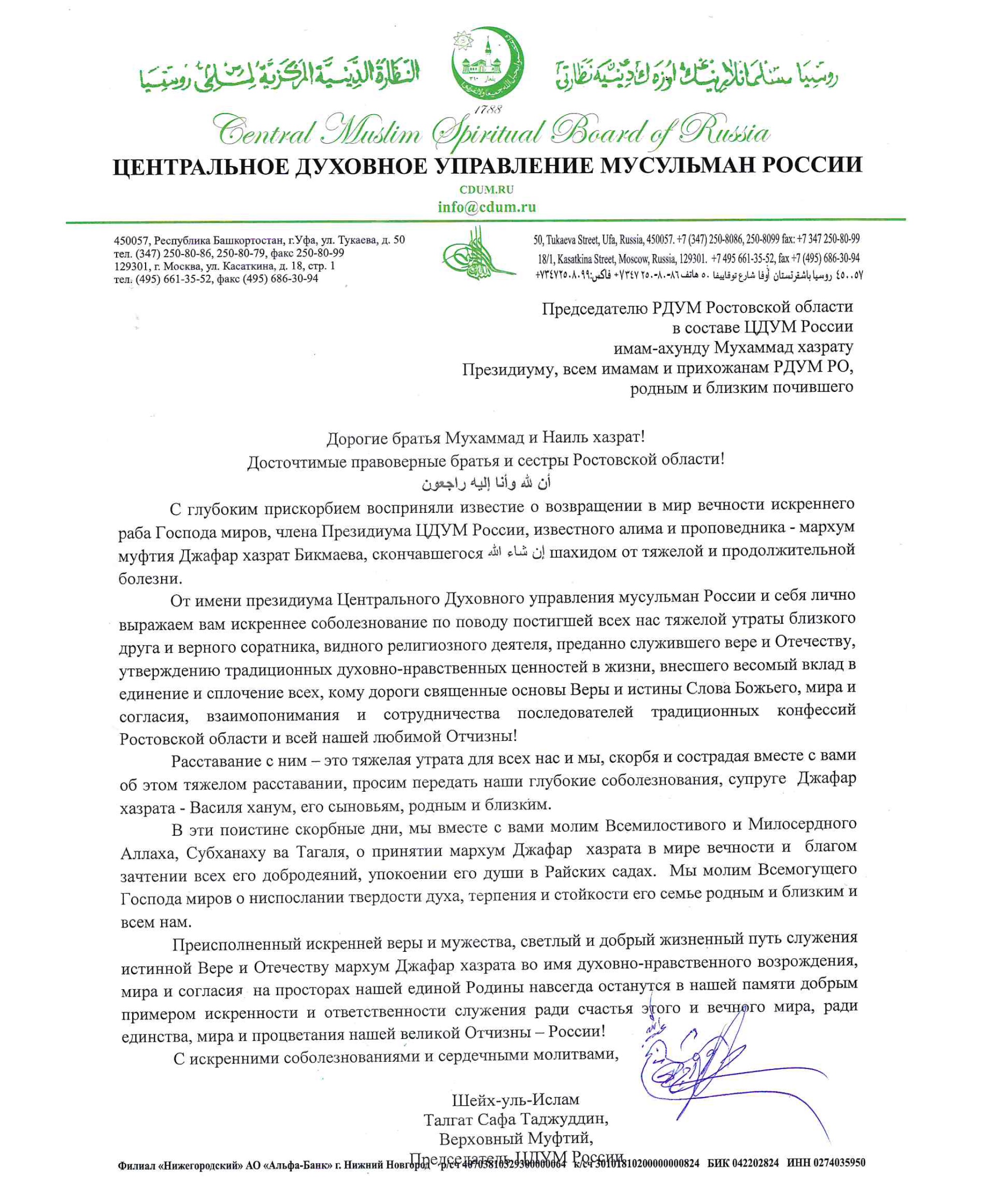В адрес Центрального духовного управления мусульман Ростовской области, родных и близких продолжают поступать слова соболезнования в связи с кончиной муфтия Ростовской области Джафяр хазрата Бикмаева.