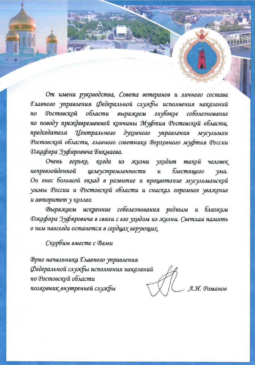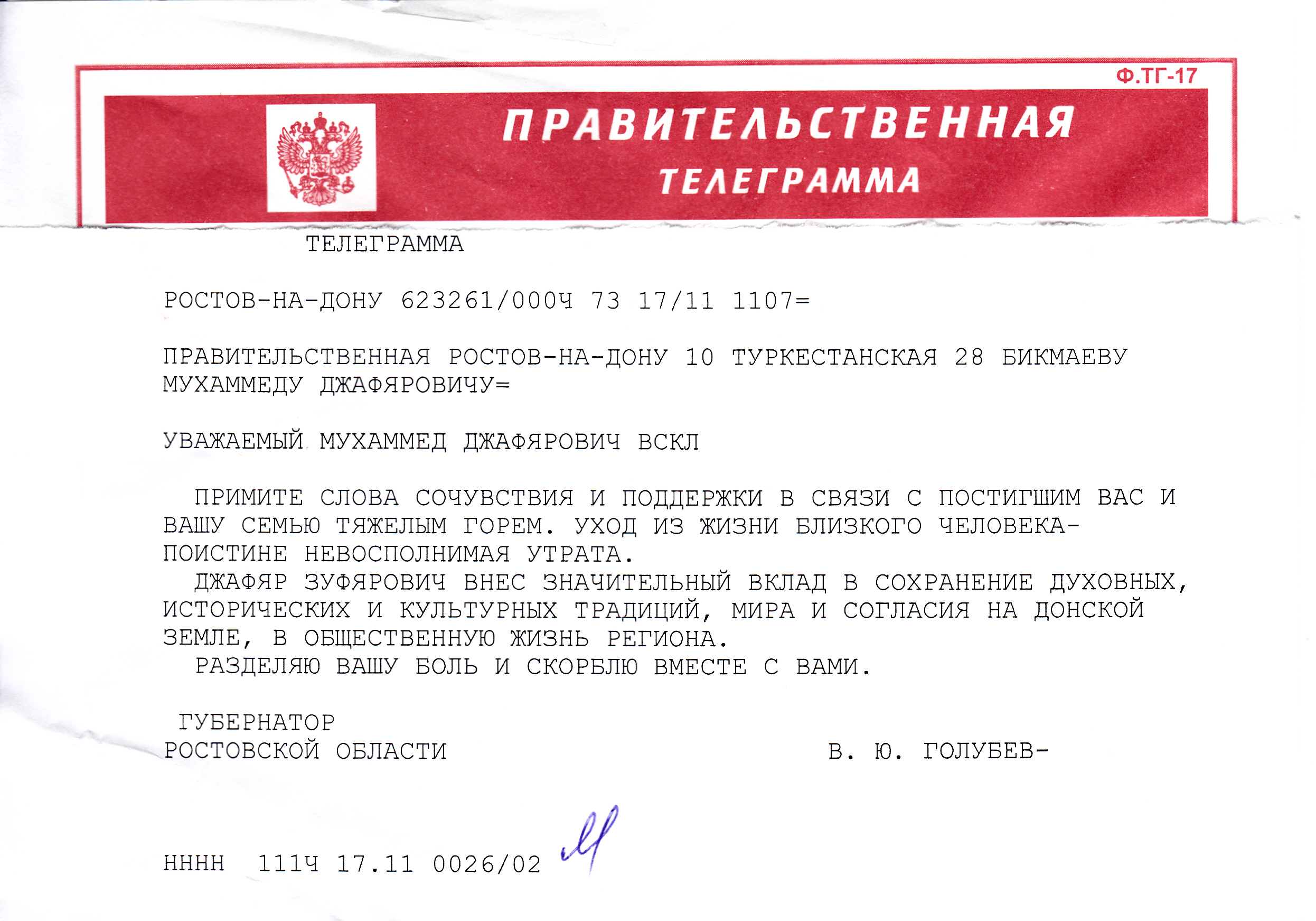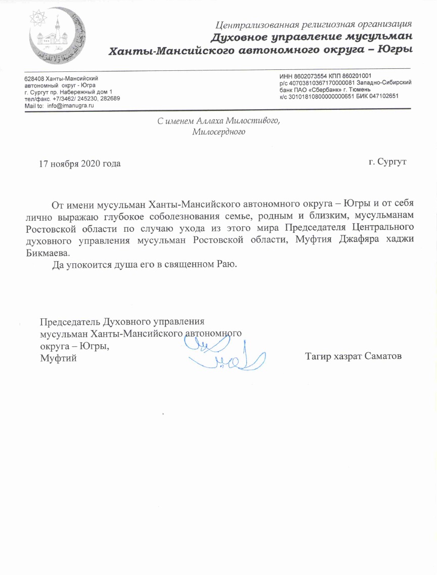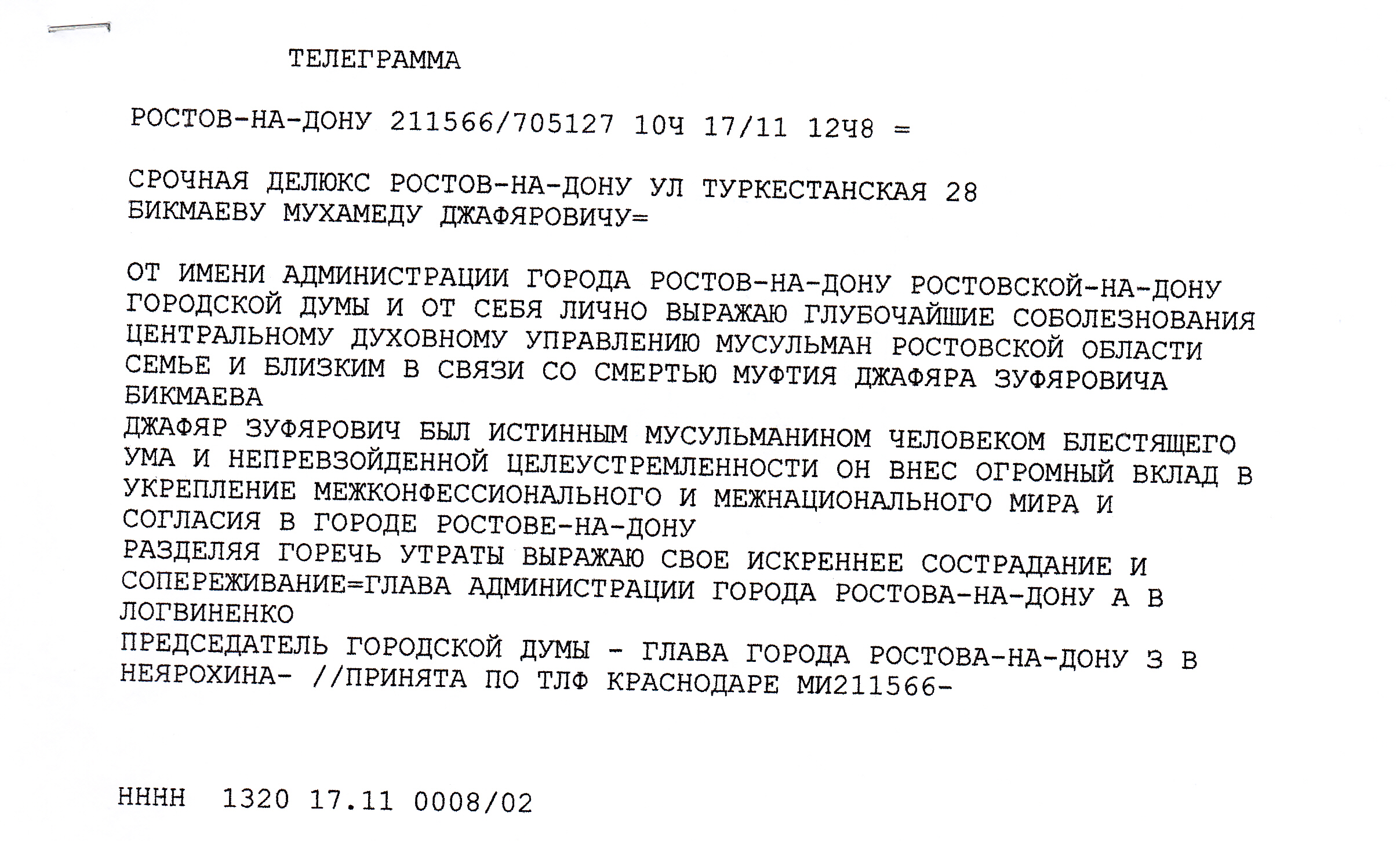 В адрес Центрального духовного управления мусульман Ростовской области, родных и близких продолжают поступать слова соболезнования в связи с кончиной муфтия Ростовской области Джафяр хазрата Бикмаева.