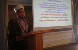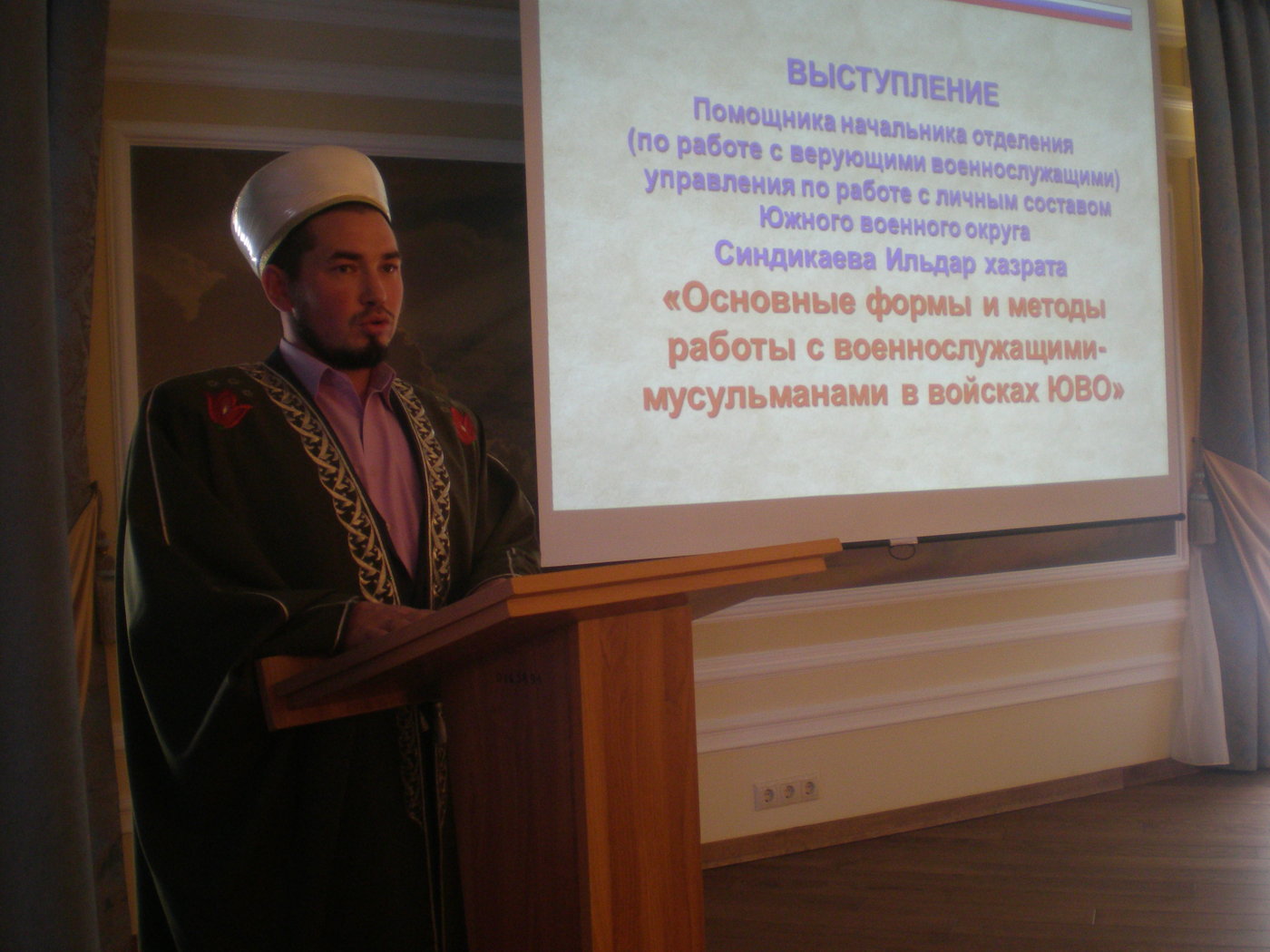 Со своим докладом выступил помощника начальника отделения по работе с верующими военнослужащими управления по работе с личным составом Южного военного округа Синдикаев Ильдар хазрат на тему: "Основные формы и методы работы с военнослужащими-мусульманами в войсках Южного военного округа".
